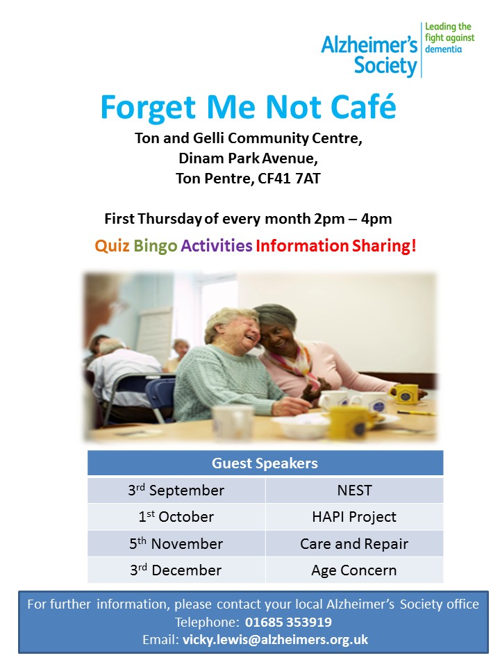 ☎    01685 353919          ✉  vicky.lewis@alzheimers.org.ukForget Me Not Café - Rhondda